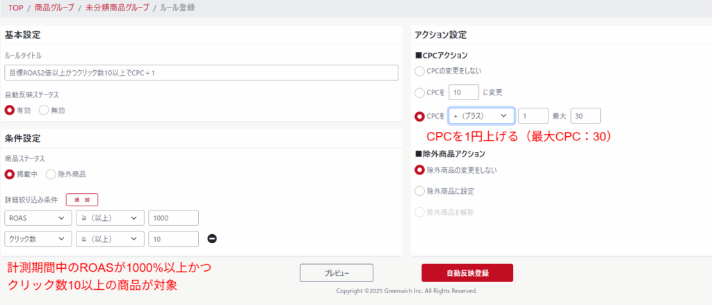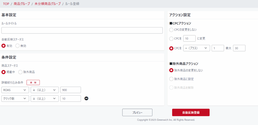 CPCアクション条件を満たした商品に対してどのようなCPCアクションを行うか設定します
