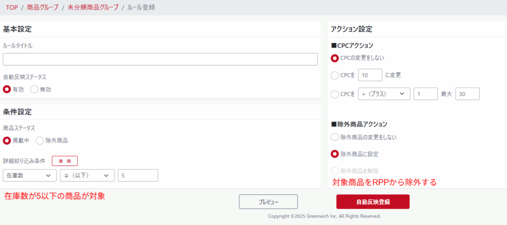 プレビュー機能を使うことで、自動化ルールが適用される商品を確認することができます。