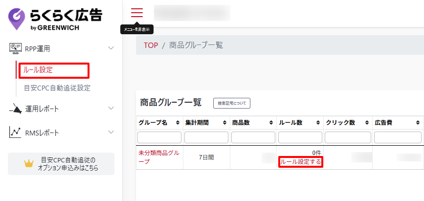 ルール設定は、管理画面にログインし、RPP運用>ルール設定の順にクリックし商品グループ一覧ページを表示し、各商品グループの「ルールを設定する」から行います。