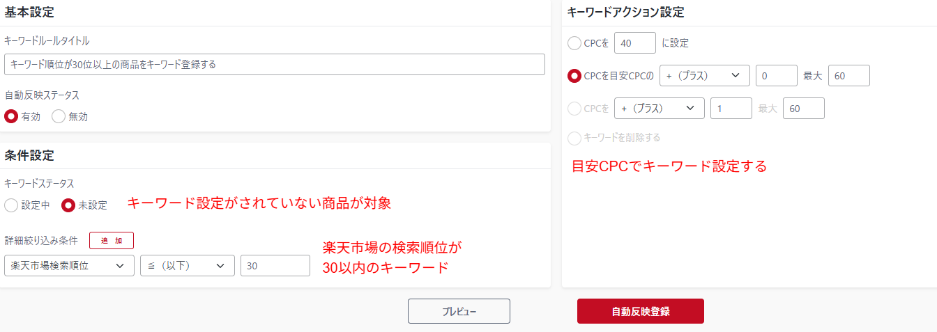 画像のように設定すると、楽天市場の検索順位で30以内のキーワードを持ち、かつキーワード設定がされていない商品を目安CPCの入札価格でキーワード設定します。