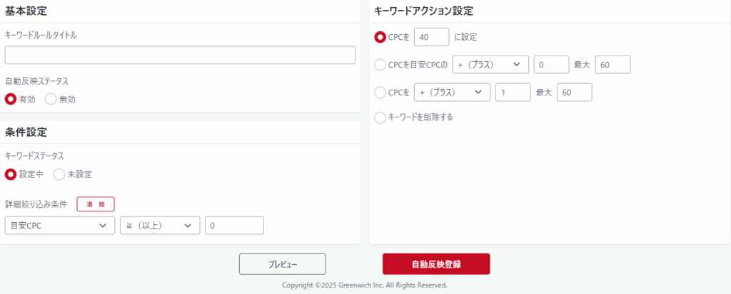 | キーワードアクション | 条件を満たした商品に対してどのようなCPCアクションを行うか設定します。 |